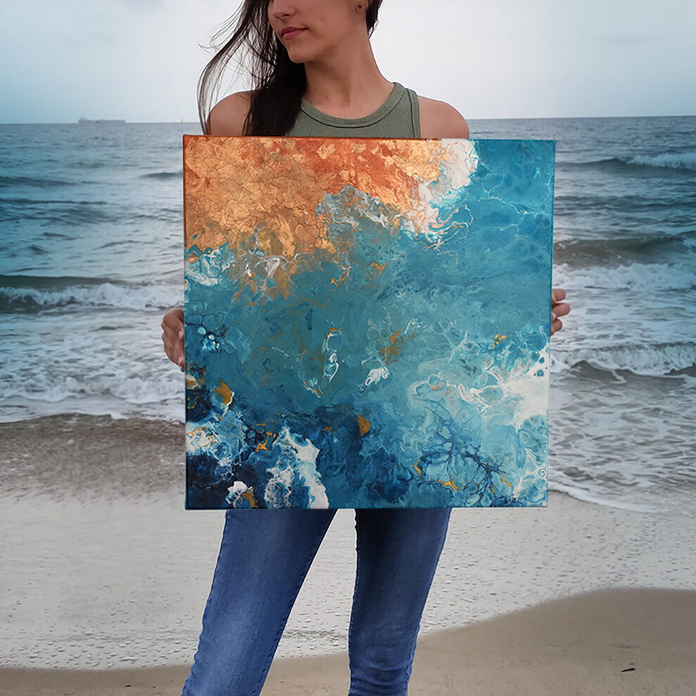 Mi mayor fuente de inspiración reside en la naturaleza, en el Océano. Utilizo la técnica del pouring para representar su esencia en mis obras. Cada pieza es una aventura, una colaboración entre mis intenciones y la sorprendente personalidad de la pintura. Un recordatorio de que la belleza auténtica a menudo surge cuando dejamos espacio para lo inesperado.
